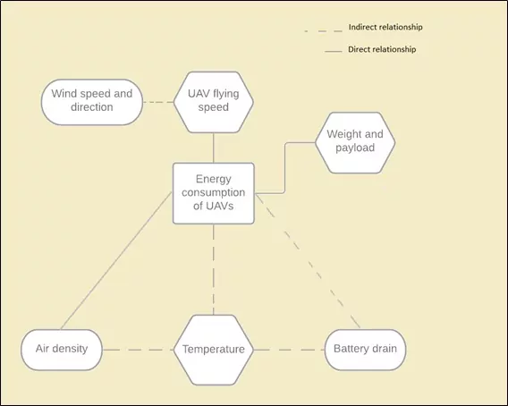 The estimation of Energy Consumption in Unmanned Aerial Vehicles with its self-weight was defined through the various implementation calculations beyond its various service environments.The major factor that affects energy consumption is extreme windbecause it changes the direction and it also may affects the flying status of UAV either positively or negatively. Air densityinfluences the proper lifting capacity of aircraft with variant changes of temperature. Appropriate equations and testing techniques have been used to estimate the power consumption of the essential parts of the UAV. Here to reduce the energy consumption in a hard environment, we implying a proper routing system to withstand extreme winds. And by the self-load estimation calculation that the Energy Consumption in Unmanned Aerial Vehicles were processed based on temperature, air density, and the battery system