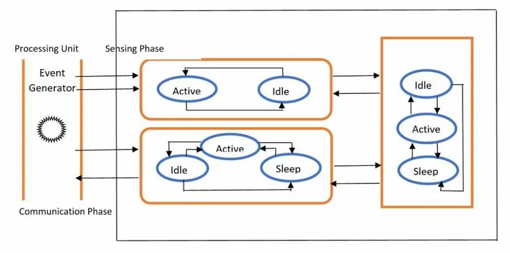 The proposed system uses a four-state model where every node uses a specific state. Every state executes with different energy levels. The sensed data packets are collected by the nodes and passed to the base station to analyze further. The base station consists of analyzer module which analyses the contents of the data packets and transmits the control messages to the nodes according to the contents. The node adapts a specific state after receiving the control message. Thus, analyzer module changes the state of a node and control messages are responsible for the proper functioning of the nodes. CADS work in different phases. The nodes are categorized in to four different states based on the activation of different components present inside the sensor node. The sensing module senses the event and passes the data to the microprocessor which forwards it to communication module.